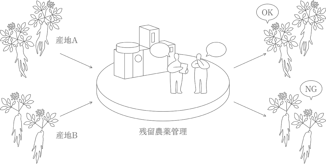 天産物である生薬は、栽培や加工、流通を通して、夾雑物と呼ばれる異物が混入します。私たちは、夾雑物をできるだけ除くためにさまざまな重層的な取り組みを行っています。