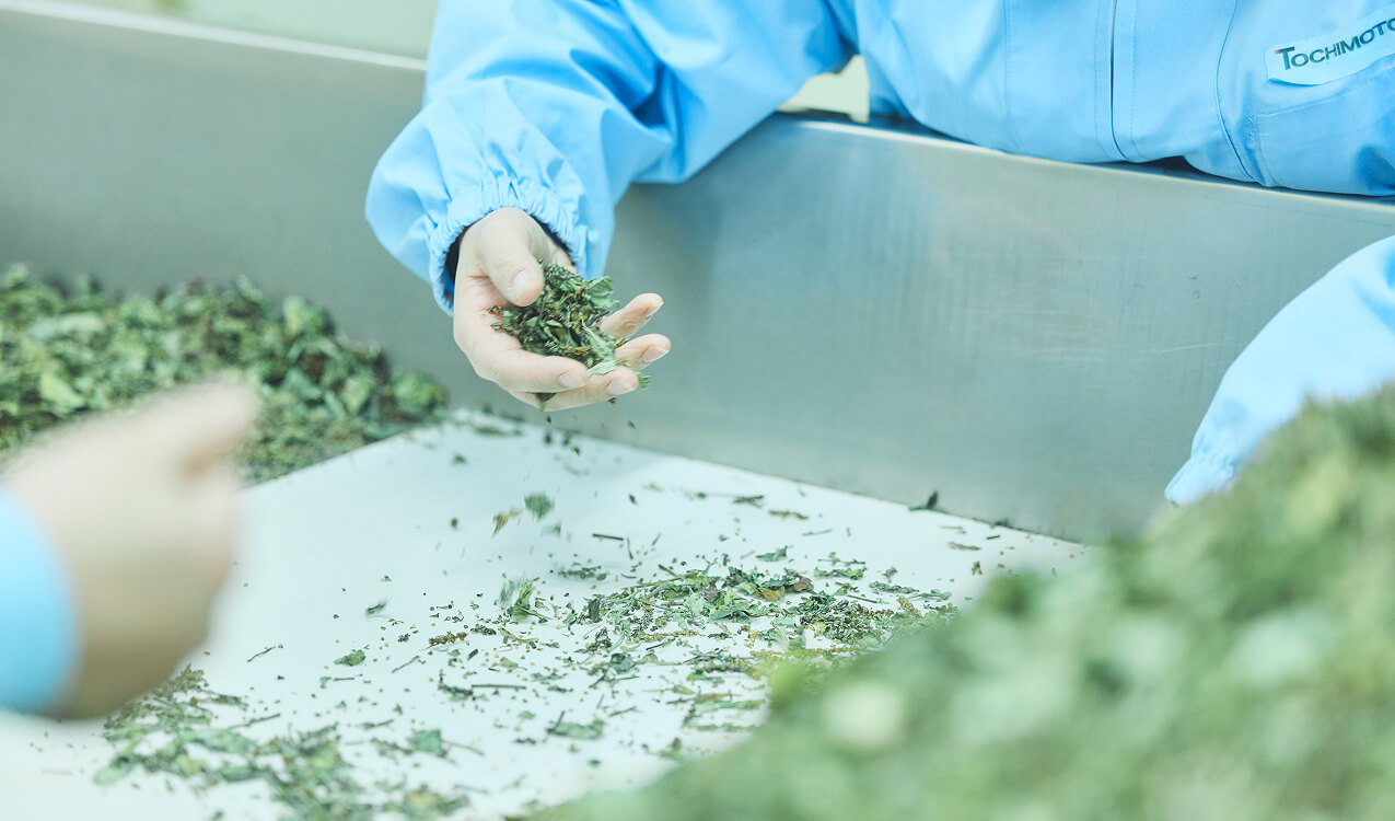 また、限りなく夾雑物除去を徹底するべく、栃本天海堂がこだわっているのは、人による手選別です。機器による異物除去に加えて、原料に応じて人が目視で手選別を行っています。手選別は、日々の膨大な原料確認により熟練した専門の社員たちが担当しています。